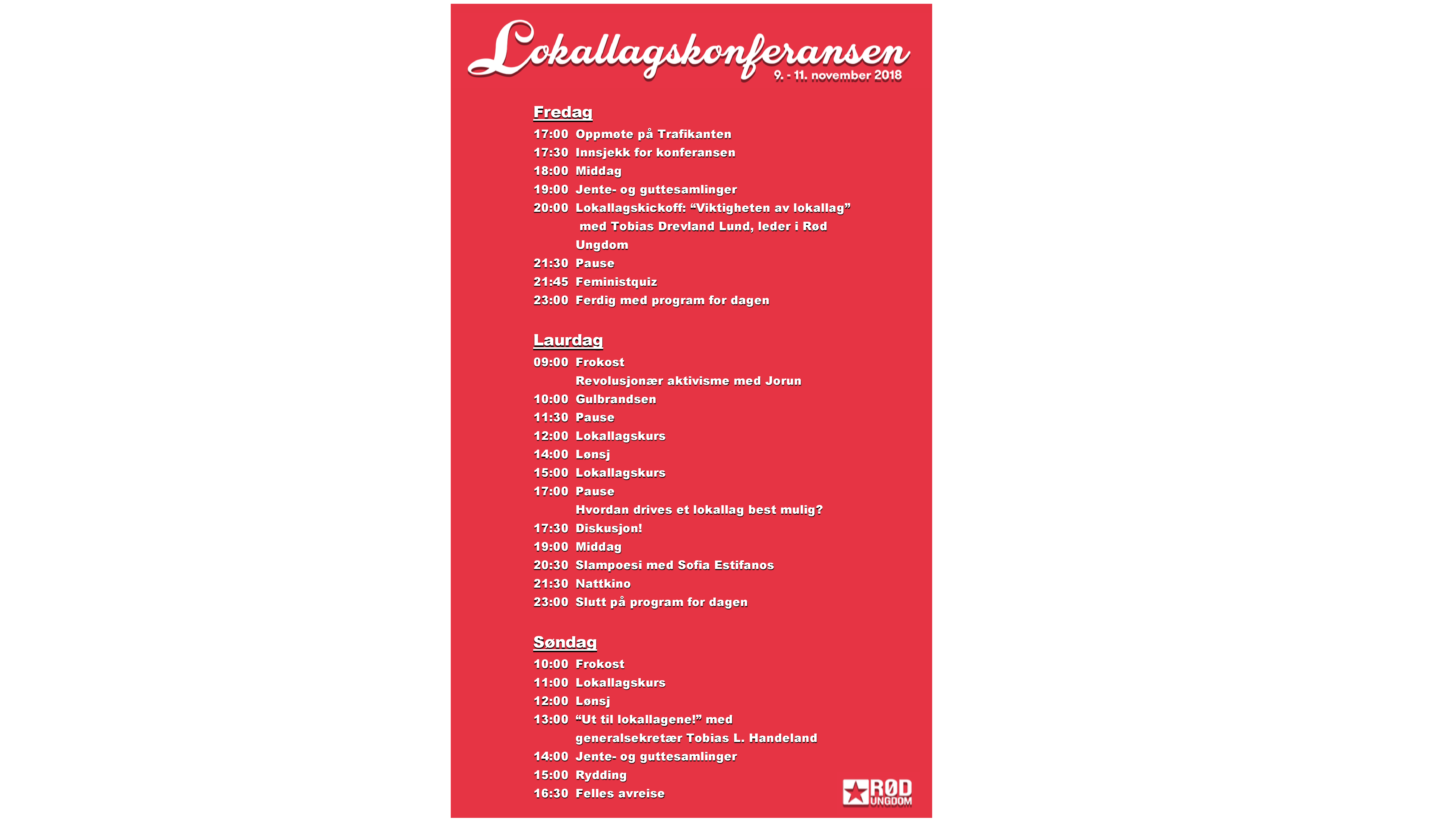 Hvem er lokallagskonferansen for?: Det er for deg som ønsker å lære mer om hvordan en driver lokallag i Rød Ungdom og som ser frem til en sosial helg der du møter andre medlemmer fra hele landet. Konferansen er for deg som er en erfaren lokallagsleder, eller deg som ikke vet noe om hvordan en driver et lokallag, for deg som ikke vet så mye om Rød Ungdom fra før av eller for deg som ønsker å aksjonere!